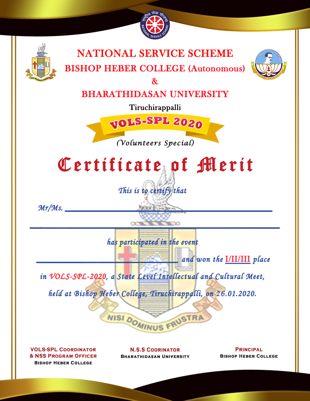 Model Design of Certificate for National Service Scheme(NSS), Bishop Heber College